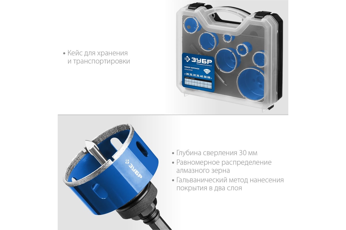 НАБОР коронок алмазных 20-68 мм по керамике и стеклу Р60-100 7 шт Профессионал ЗУБР